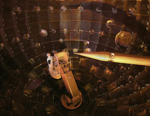 The NIF uses 192 laser beams that produce a total of 1.9 megajoules of energy for a period lasting a few nanoseconds to trigger the fusion reaction. Fuel is placed inside a metal capsule a few millimetres across, which, when heated by lasers, emits X-rays that heat up and compress the fuel.