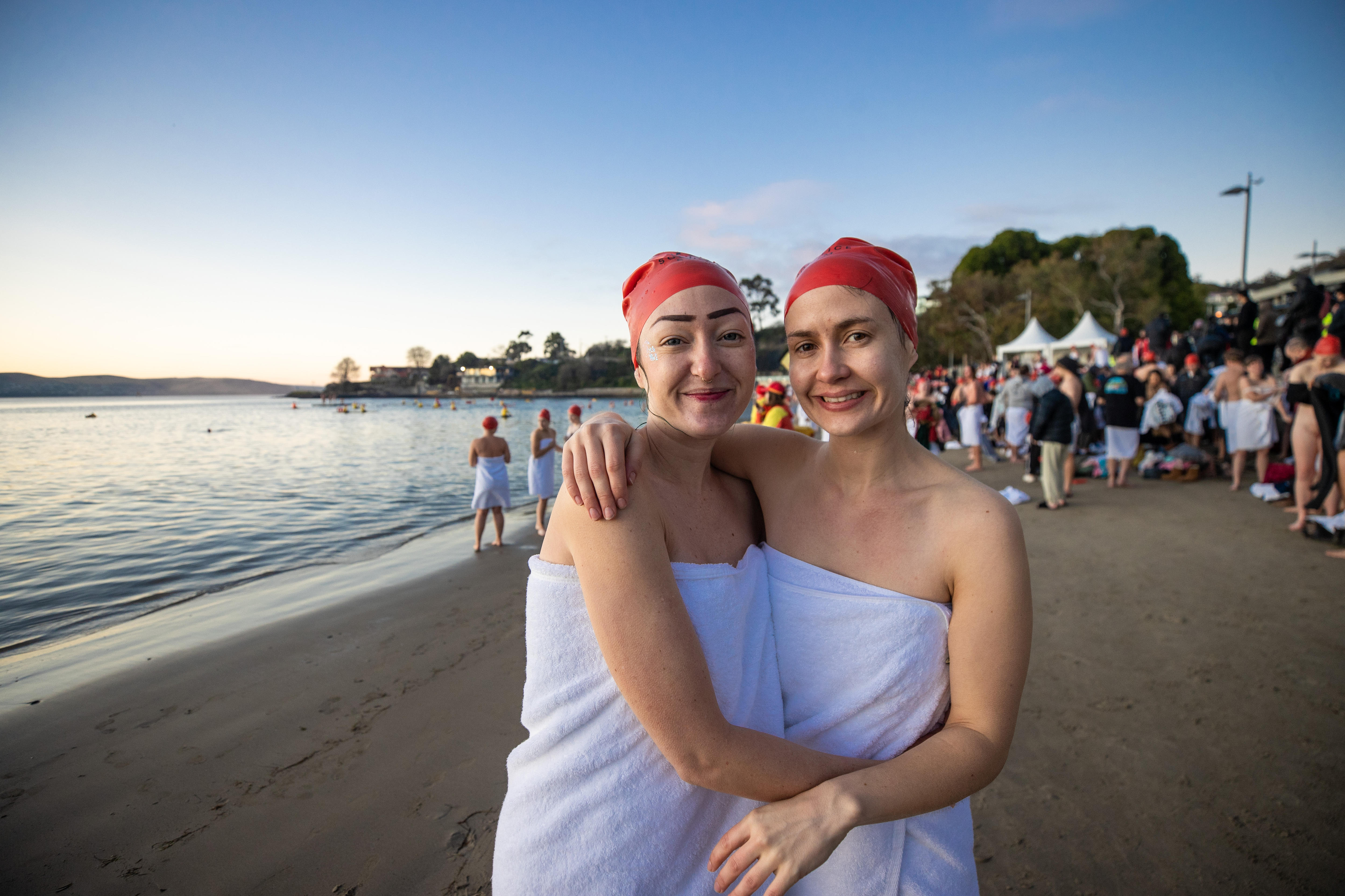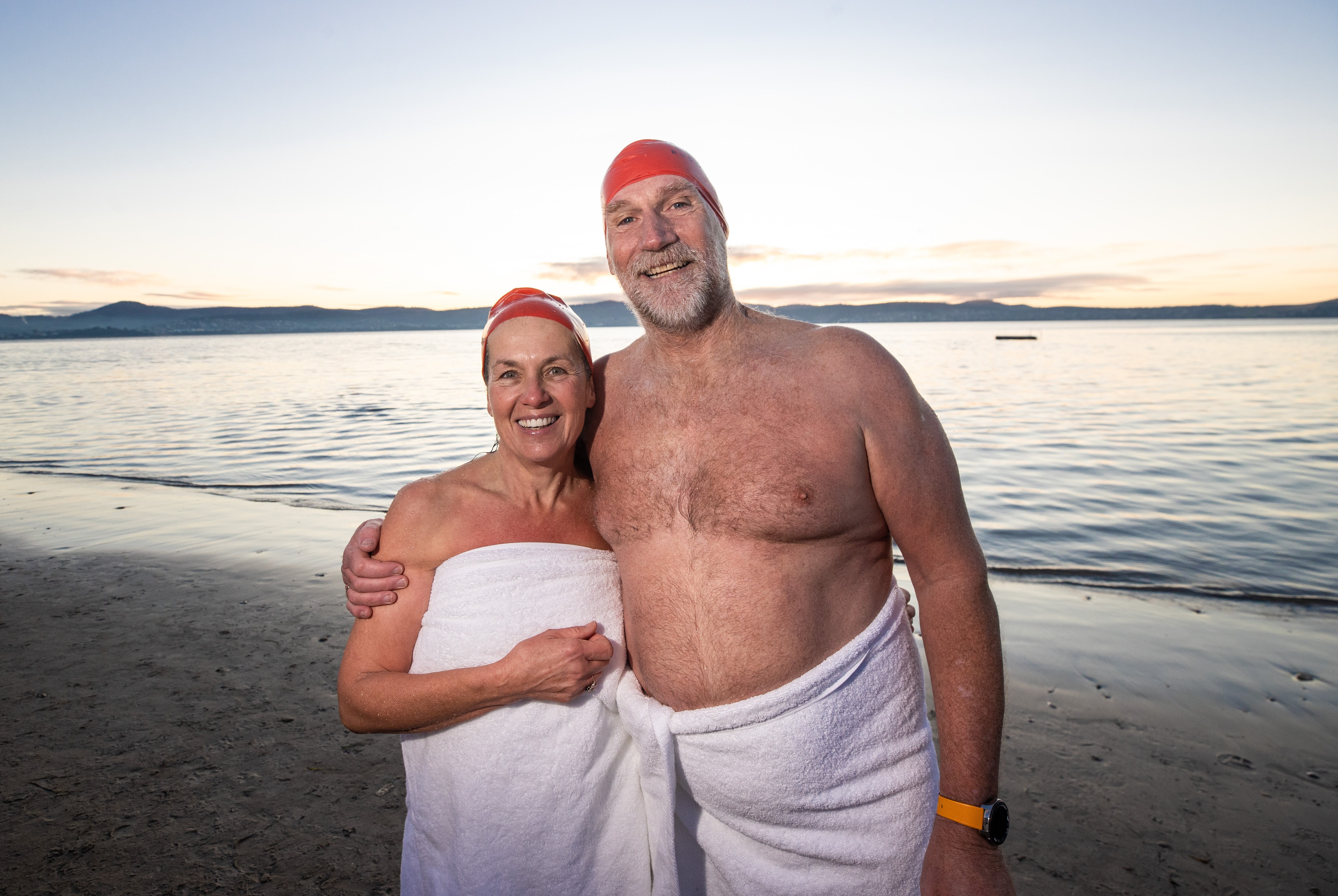 New South Wales tourists Kerry Watson and Colin Sandbach joined the swim after an internet search of the best winter activities on a trip to Tasmania.