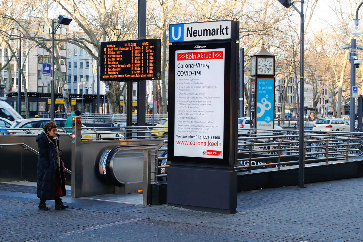A board with corona informations is seen at the Neumarkt subway station, as the spread of coronavirus disease (COVID-19) continues in Cologne, Germany, March 30, 2020. REUTERS/Wolfgang Rattay