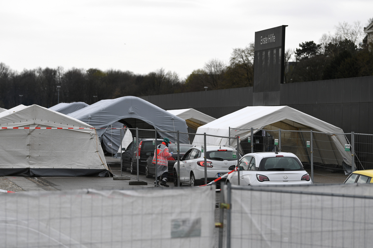Cars wait in line at a drive-in coronavirus check facility as the spread of the coronavirus disease (COVID-19) continues, in Munich, Germany, March 30, 2020. REUTERS/Andreas Gebert