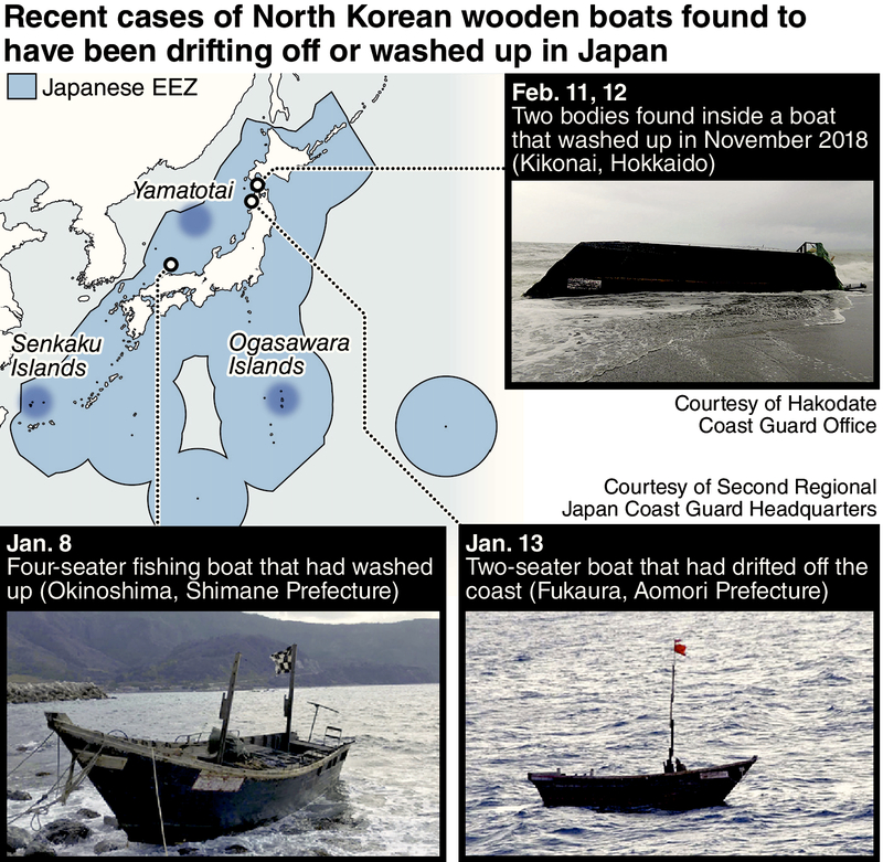 On Feb. 11 and 12, two bodies believed to be those of men were found inside a wooden boat that was being dismantled on the coast in the town of Kikonai, Hokkaido, which faces the Sea of Japan.