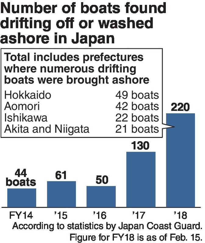 An increasing number of wooden boats believed to be registered to North Korea have been found drifting off Japan or washed ashore. In fiscal 2018, which ends March 31, there have already been a total of 220 such boats, 1.7 times more than the previous fiscal year, which had marked a record high.