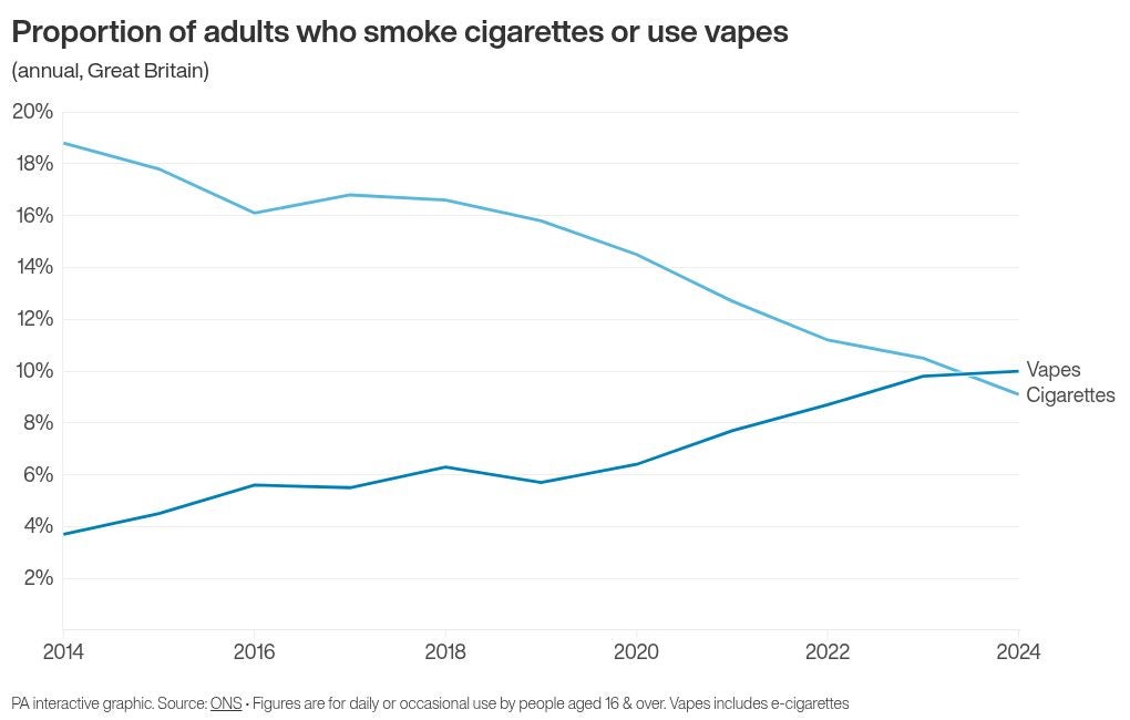 Data from 2024 indicates that one in 10 adults aged 16 and over (10 per cent) now use e-cigarettes daily or occasionally.