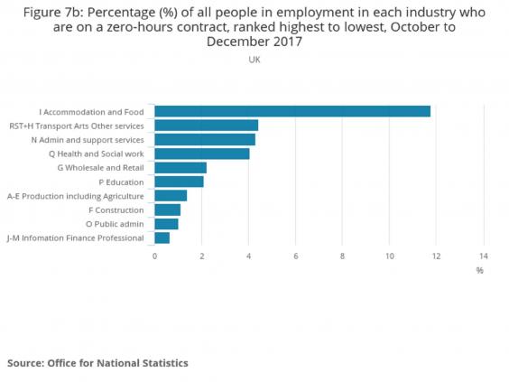 The industry sectors with the largest shares of workers on zero hours are accommodation and food (11.8 per cent), followed by health and social work, transport and administration (all on around 4 per cent).
