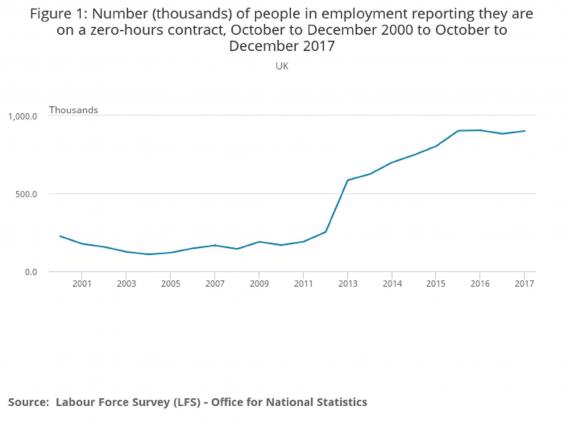 The agency reported that in its latest survey of firms there were 1.8 million contracts that did not guarantee a minimum numbers of hours in the year to November 2017. The equivalent number in November 2016 was 1.7 million.