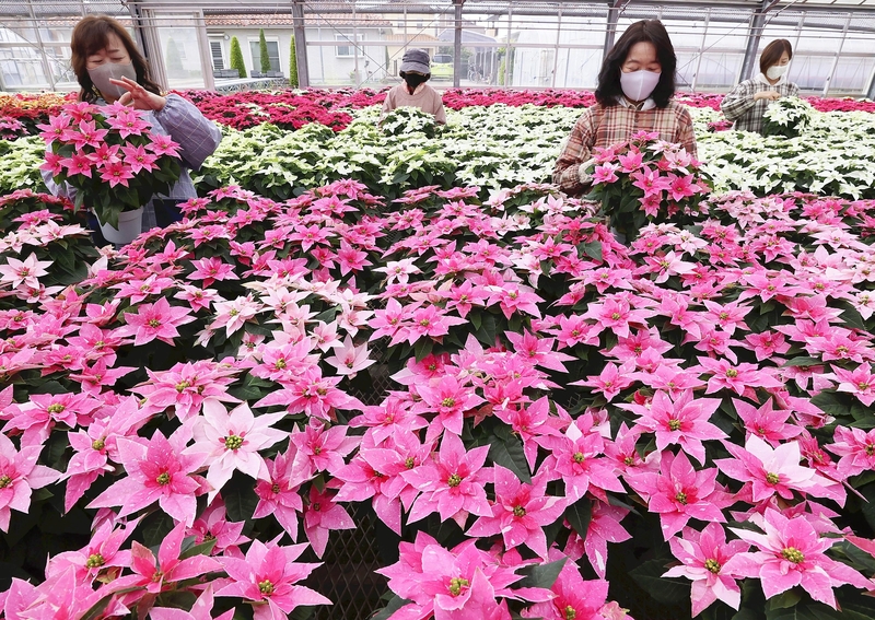 Workers check potted princettias at a nursery in Kokubunji, Tokyo, on Tuesday as the industry gears up for the peak season of the Christmas plants. The princettia is a variety of the poinsettia, and the plant is a symbol of compassion. From mid-November to early December, the Matsumoto Engei nursery ships about 13,000 pots of princettias and poinsettias, mainly in the Tokyo metropolitan area. The flowers are also popular gifts for "happy married couples day" on Nov. 22. "I hope people will celebrate their anniversary by decorating [their home] with these colorful plants," said Yoshitaka Matsumoto of the nursery.