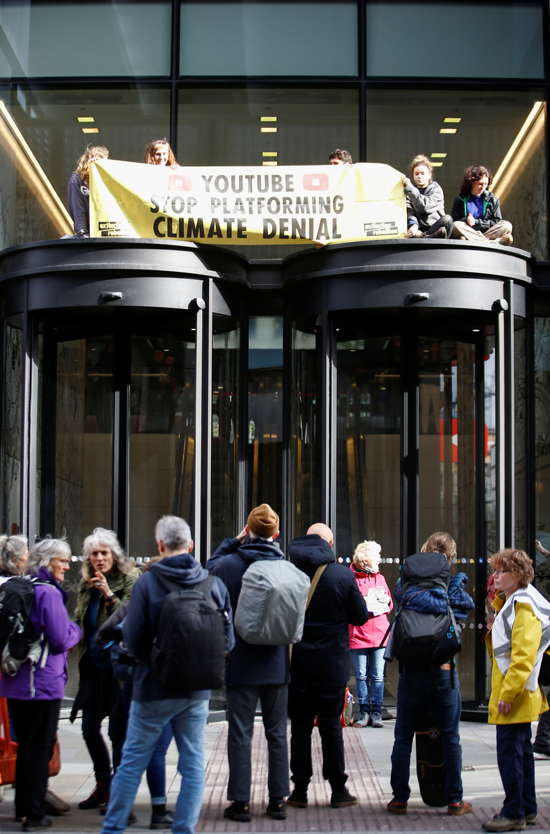Separately, about five Extinction Rebellion volunteers scaled the entrance to YouTube's London office and unfurled a banner that said: "YouTube Stop Platforming Climate Denial."
