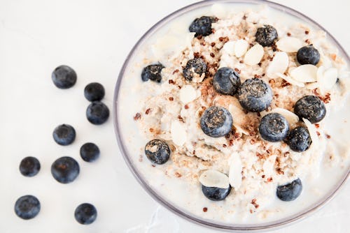 Michelle Jaelin, RD, adds berries like strawberries, blueberries or blackberries and a small handful of walnuts to her steel cut oats and yogurt on a weekday morning. "Berries are high in antioxidants and steel cut oats are a complex carbohydrate high in soluble fiber, [which is] essential for healthy digestion and lowering LDL cholesterol," she explained via email. "Breakfast is a great way to try to meet most of your daily fiber needs." The yogurt also adds protein and calcium to an already nutritious breakfast.