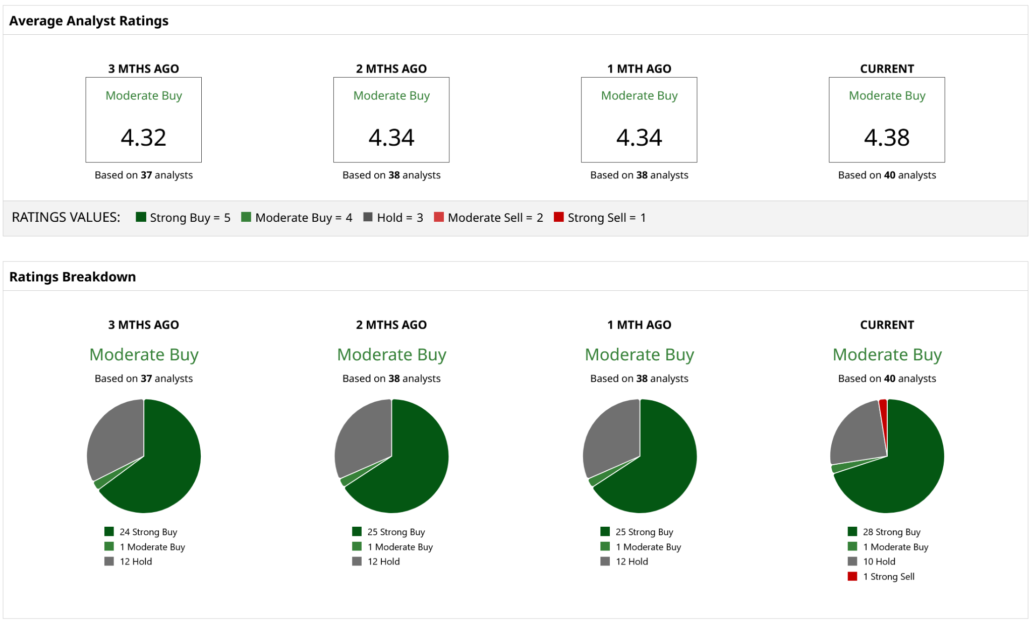 The consensus analyst rating for Oracle is “Moderate Buy,” based on 40 analyst ratings. Twenty-eight of these analysts have a “Strong Buy” rating on ORCL stock, which shows how bullish the market currently is on the company’s prospects. Only three more “Strong Buy” ratings have been assigned since the $300 OpenAI deal, which shows that a vast majority of the analysts were already bullish on the stock even before that mega deal happened.