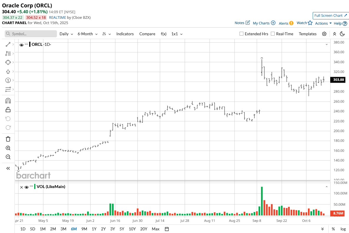 Oracle is a company that provides products and services that help businesses run their IT environments. The company currently has a market cap of around $850 billion and is based in Austin, Texas. It is up an impressive 81% this year so far, comfortably outpacing the S&P 500’s ($SPX) 12.66% gains, thanks to its critical role in providing AI infrastructure.