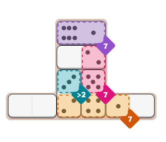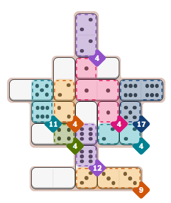 In the above example from a medium puzzle, there are four colored zones. Your placed dominoes must total 12 in the purple zone. In the teal and orange sectors, the number of domino pips must be greater than 3.
