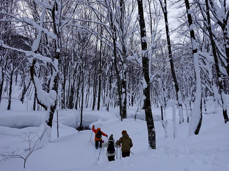 The next morning, I went on a snowshoe hike organized by the hotel. Wearing snowshoes, which are like kanjiki (traditional Japanese snowshoes), I walked around the beech forest surrounding the hotel. Led by Masami Banba, 70, a staff member of the hotel and guide for walking in beech forests, we entered the forest, which is usually inaccessible because of bamboo grass bushes that cover the ground. As I walked, my leg got buried in knee-deep snow. "Such deep snow is quite unusual," Banba said in a surprised tone.