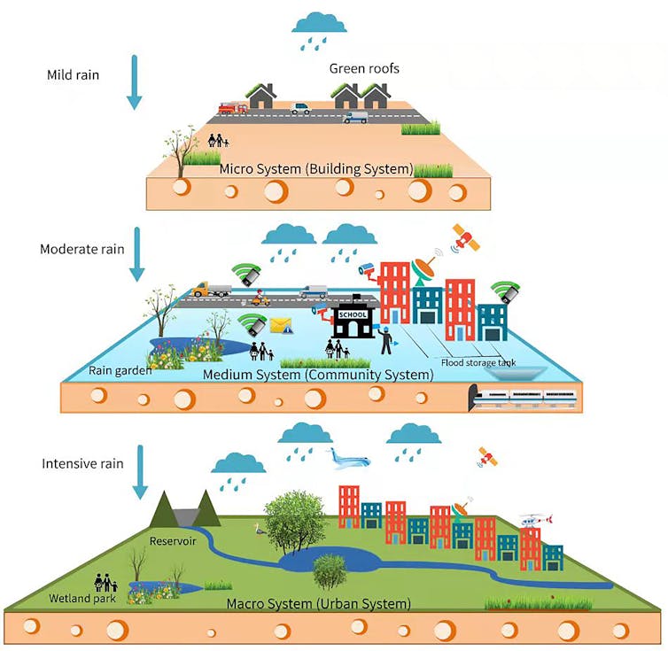 The sponge city requires a holistic approach that differs considerably from the way we currently build infrastructure. It involves integrating flood-resilient elements such as bio-swales, pervious pavements, underground water-storage tanks, rain gardens, wetlands and green roofs.