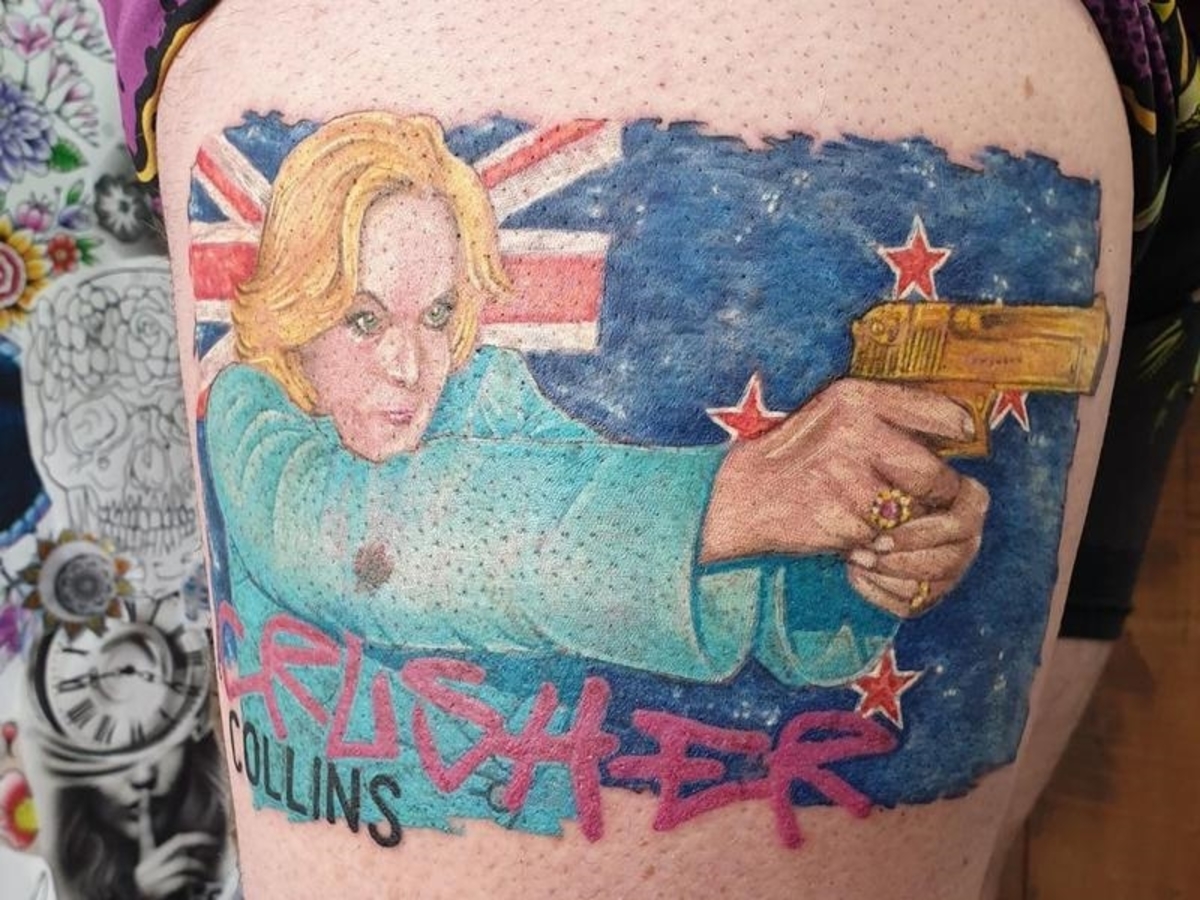 The image is a stylised rendition of photo of Ms Collins as police minister firing a gun at a training range, with the NZ flag in the background and Ms Collins' nickname "Crusher" splashed in pink.