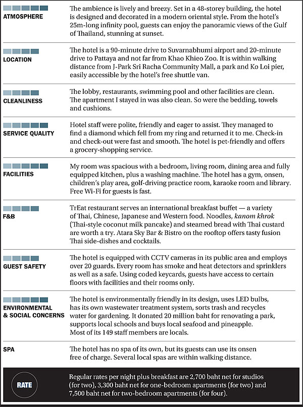 Officially opened in January, Oakwood Hotel & Residence Sri Racha is a 5-star hotel and serviced apartment with 458 guestrooms and suites and modern facilities. It suits both brief stays by leisure and business travellers and long-term stays by expats. Its six function rooms can accommodate up to 700. The hotel won two HRM Asia Readers' Choice Awards in 2018 as Best Serviced Apartment Property (Southeast Asia) and Best Corporate – MICE Venue.