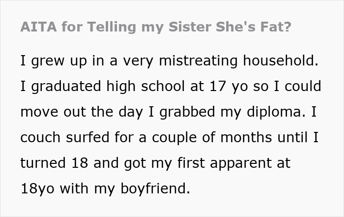 Netizens were divided on this one. Some felt that the OP’s actions were justified to some extent because the sister was physically damaging the furniture and had been accommodated. However, others criticized her outburst as unnecessarily cruel and shaming, and that the language used was personal and emotionally damaging.