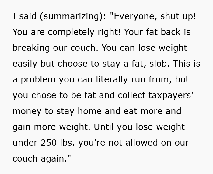 At this point, the OP lost it. She agreed that her sister was right, and that she was indeed fat when she could easily decide to lose weight but would rather not. She then added that until she lost some weight, the sister wasn’t allowed on their couch anymore. After that night, her brother-in-law left her a text about her “bullying” had caused her sister to have a mental breakdown, and urging her to apologize.