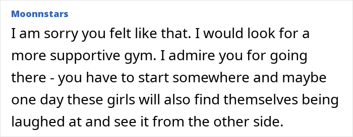 Behaviors like those of teenage girls in this story greatly contribute to gymtimidation, aka feeling anxious at the gym, which is already too high to begin with. Statistics show that 50% find the thought of going to the gym scary, and 40% even avoid working out due to gymtimidation. This is very unfortunate, as it can affect anyone, and exercise is key to our health.