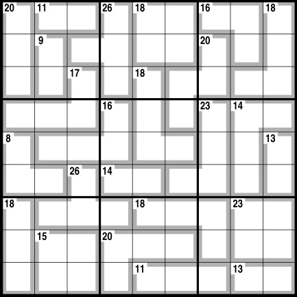 Normal Sudoku rules apply, except the numbers in the cells contained within grey lines add up to the figures in the corner. No number can be repeated within each shape formed by grey lines.