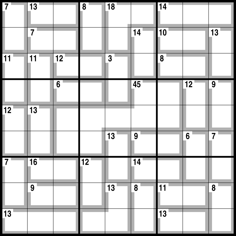 Normal Sudoku rules apply, except the numbers in the cells contained within grey lines add up to the figures in the corner. No number can be repeated within each shape formed by grey lines.