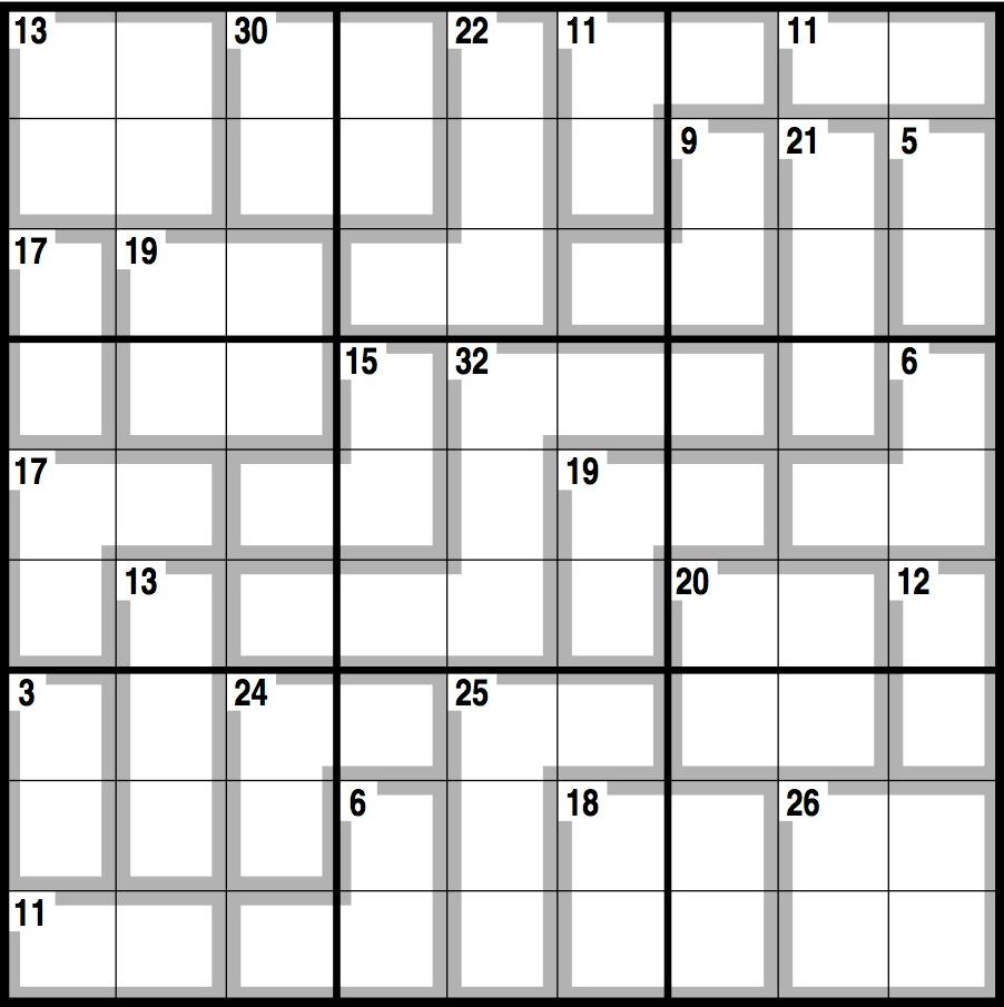 Normal Sudoku rules apply, except the numbers in the cells contained within grey lines add up to the figures in the corner. No number can be repeated within each shape formed by grey lines.