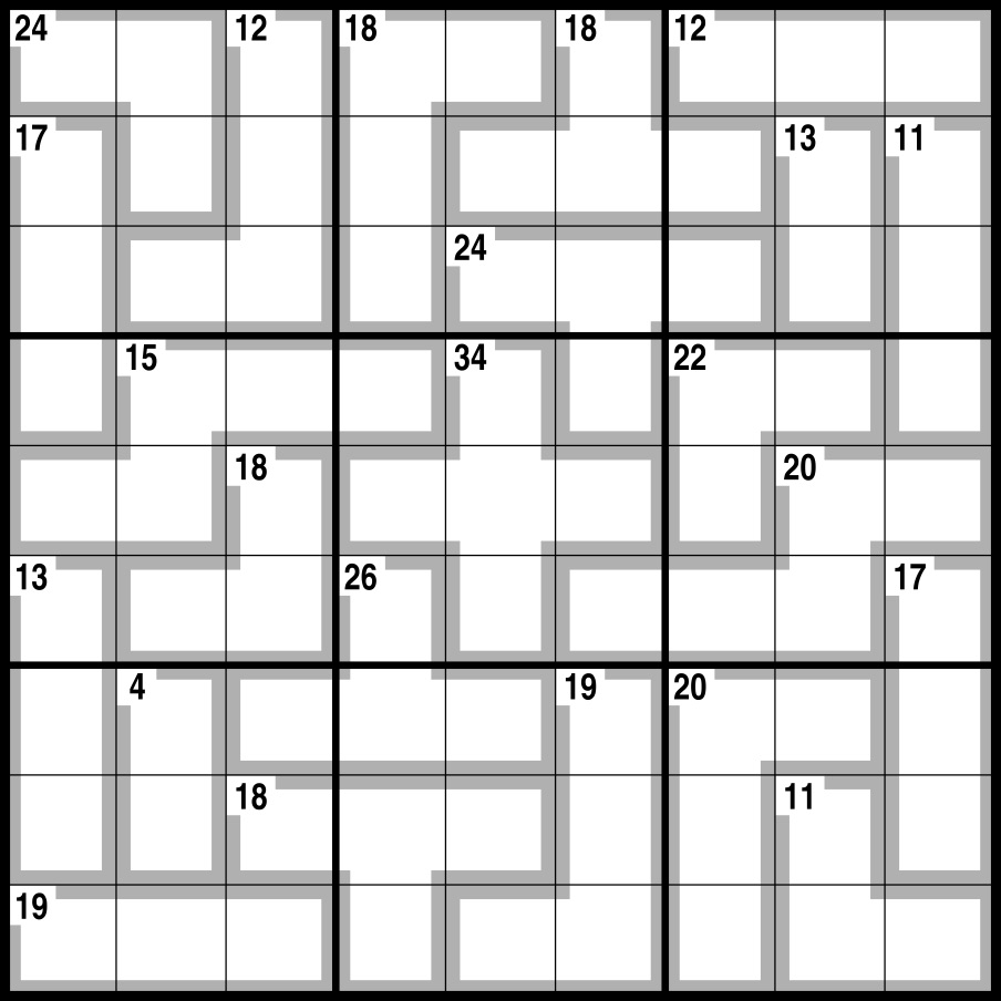 Normal Sudoku rules apply, except the numbers in the cells contained within grey lines add up to the figures in the corner. No number can be repeated within each shape formed by grey lines.