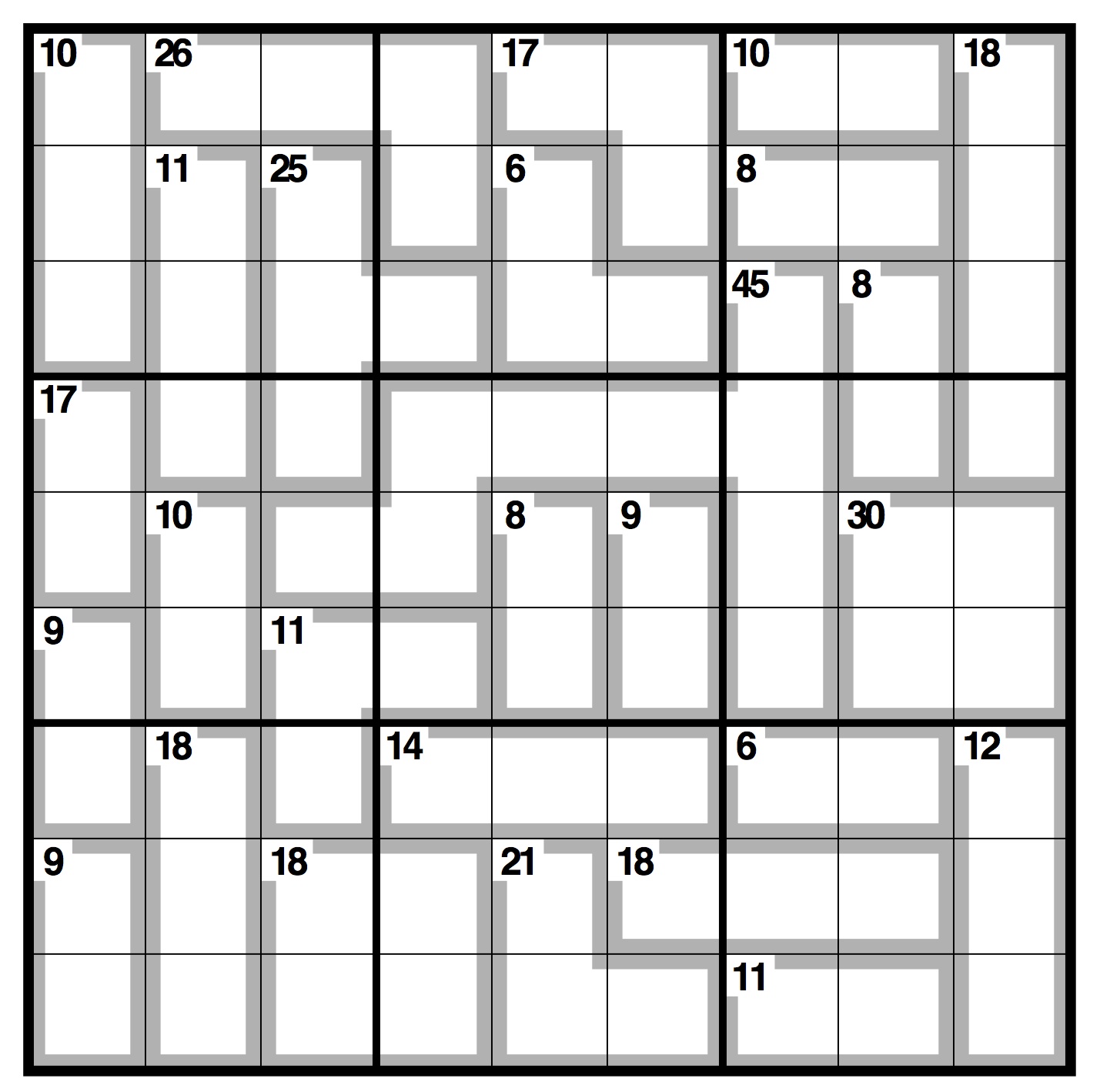 Normal Sudoku rules apply, except the numbers in the cells contained within grey lines add up to the figures in the corner. No number can be repeated within each shape formed by grey lines.