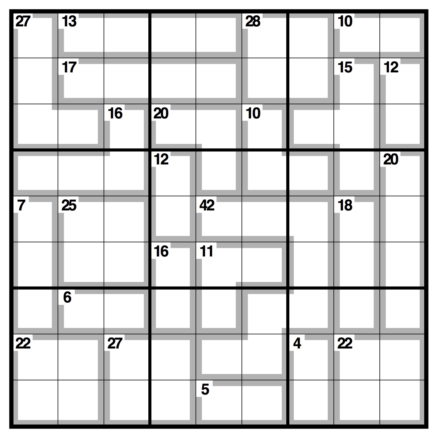 Normal Sudoku rules apply, except the numbers in the cells contained within grey lines add up to the figures in the corner. No number can be repeated within each shape formed by grey lines.