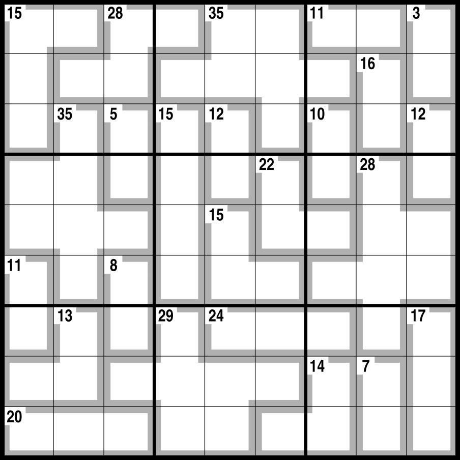 Normal Sudoku rules apply, except the numbers in the cells contained within grey lines add up to the figures in the corner. No number can be repeated within each shape formed by grey lines.