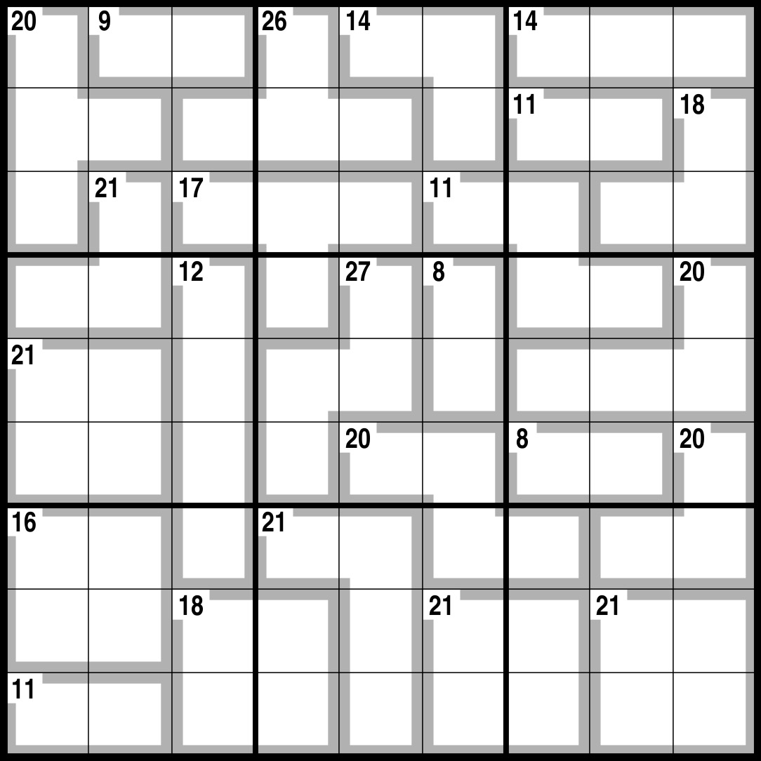 Normal Sudoku rules apply, except the numbers in the cells contained within grey lines add up to the figures in the corner. No number can be repeated within each shape formed by grey lines.