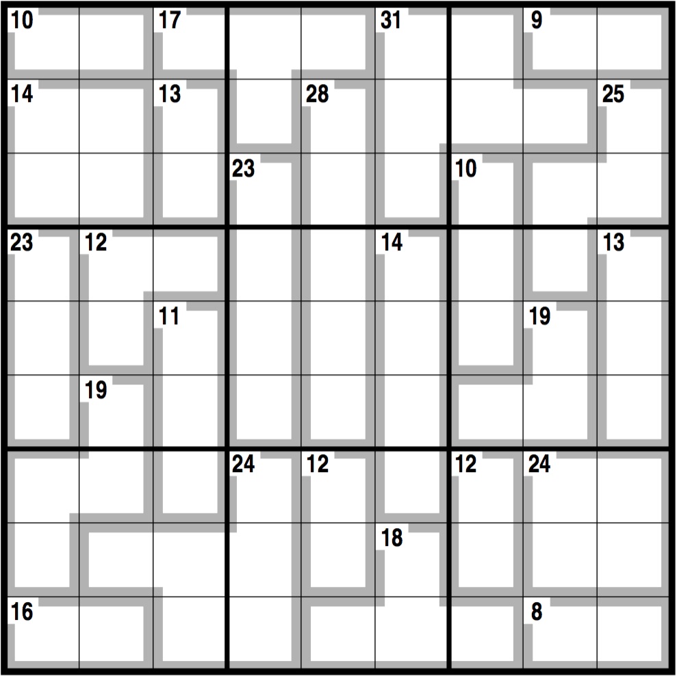 Normal Sudoku rules apply, except the numbers in the cells contained within grey lines add up to the figures in the corner. No number can be repeated within each shape formed by grey lines.