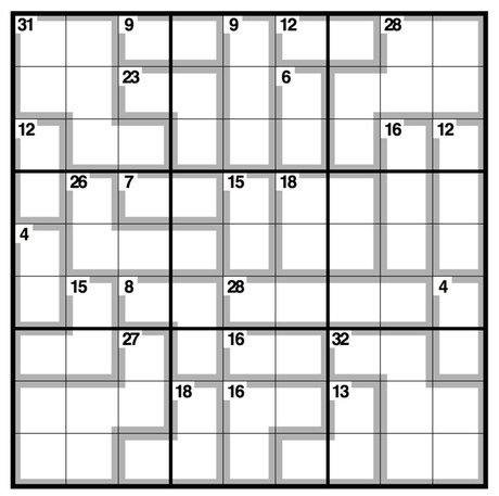 Normal Sudoku rules apply, except the numbers in the cells contained within grey lines add up to the figures in the corner. No number can be repeated within each shape formed by grey lines.
