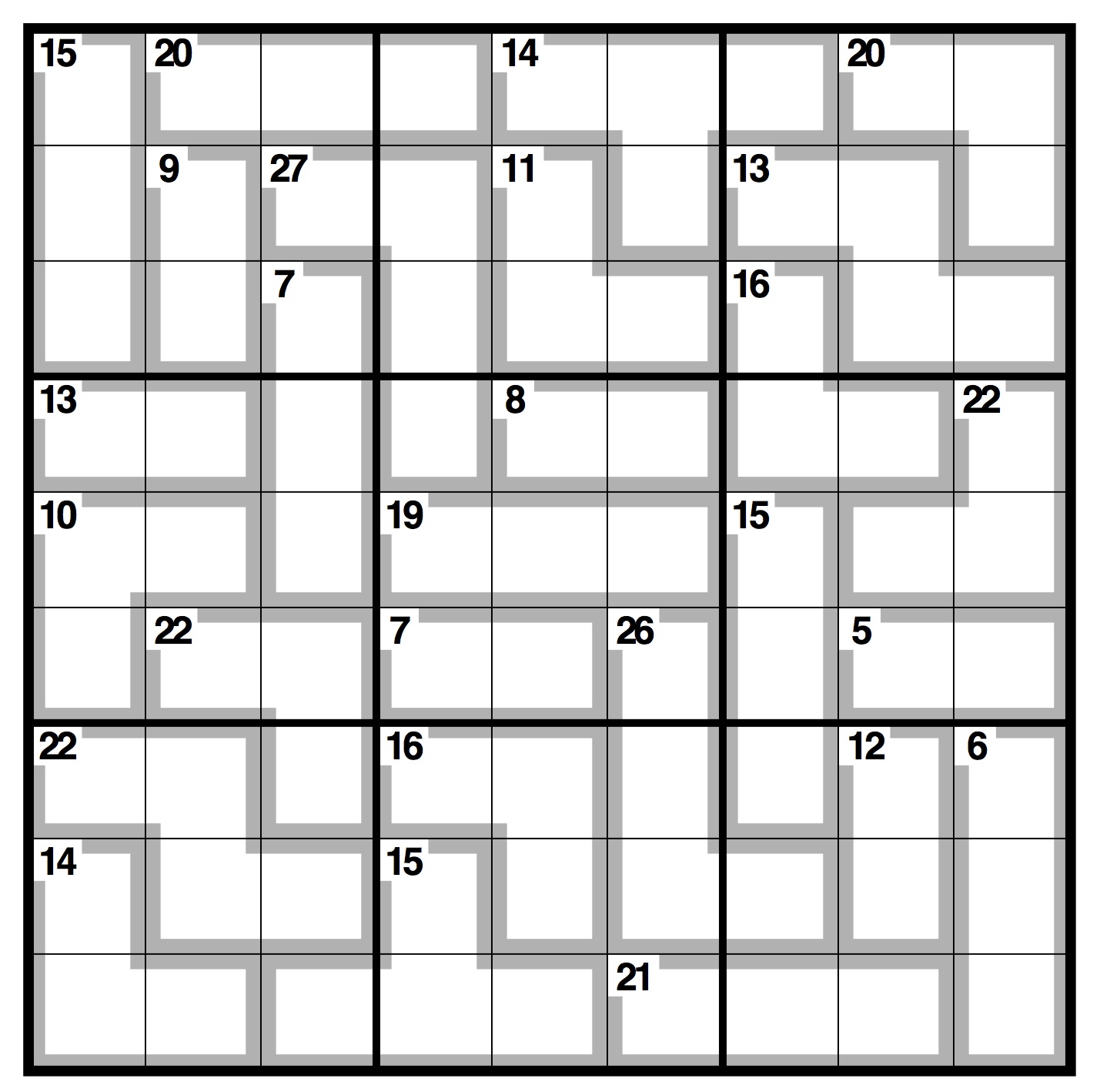 Normal Sudoku rules apply, except the numbers in the cells contained within grey lines add up to the figures in the corner. No number can be repeated within each shape formed by grey lines.