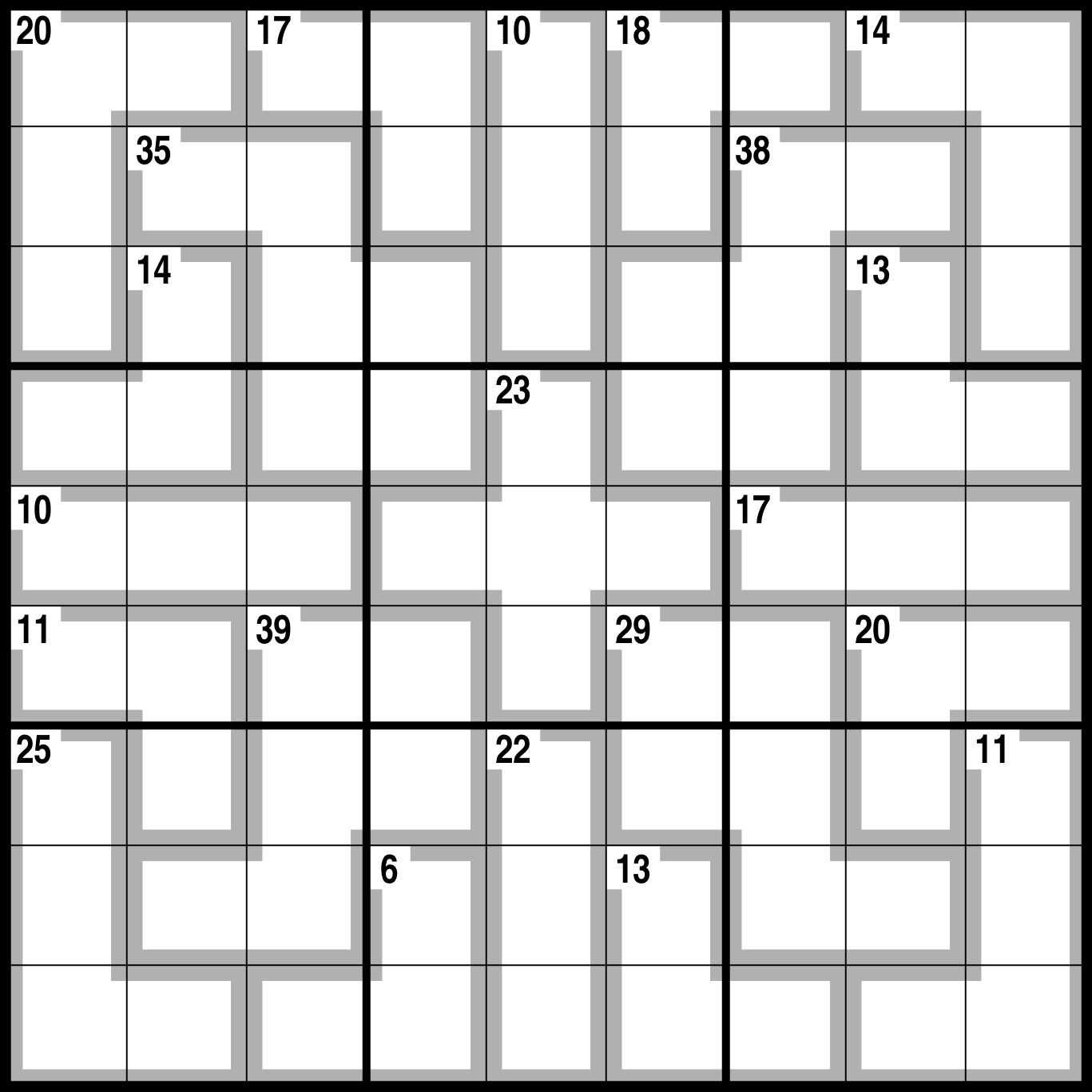 Normal Sudoku rules apply, except the numbers in the cells contained within grey lines add up to the figures in the corner. No number can be repeated within each shape formed by grey lines.