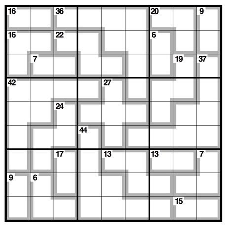 Normal Sudoku rules apply, except the numbers in the cells contained within grey lines add up to the figures in the corner. No number can be repeated within each shape formed by grey lines.