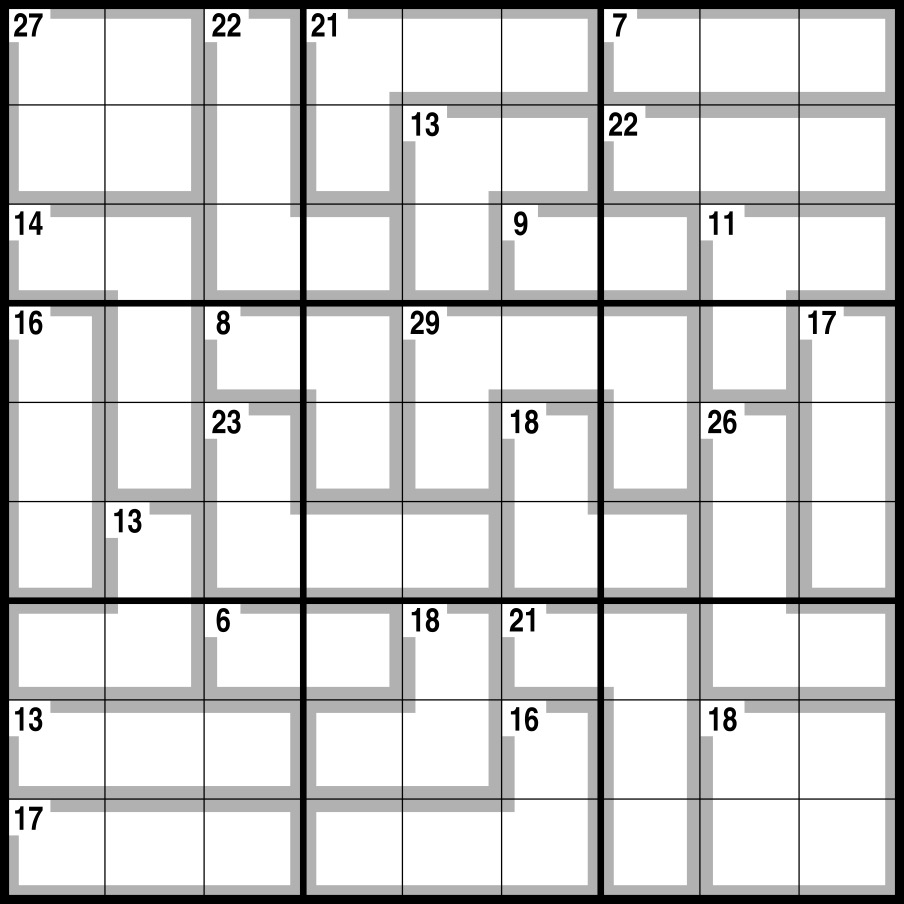 Normal Sudoku rules apply, except the numbers in the cells contained within grey lines add up to the figures in the corner. No number can be repeated within each shape formed by grey lines.
