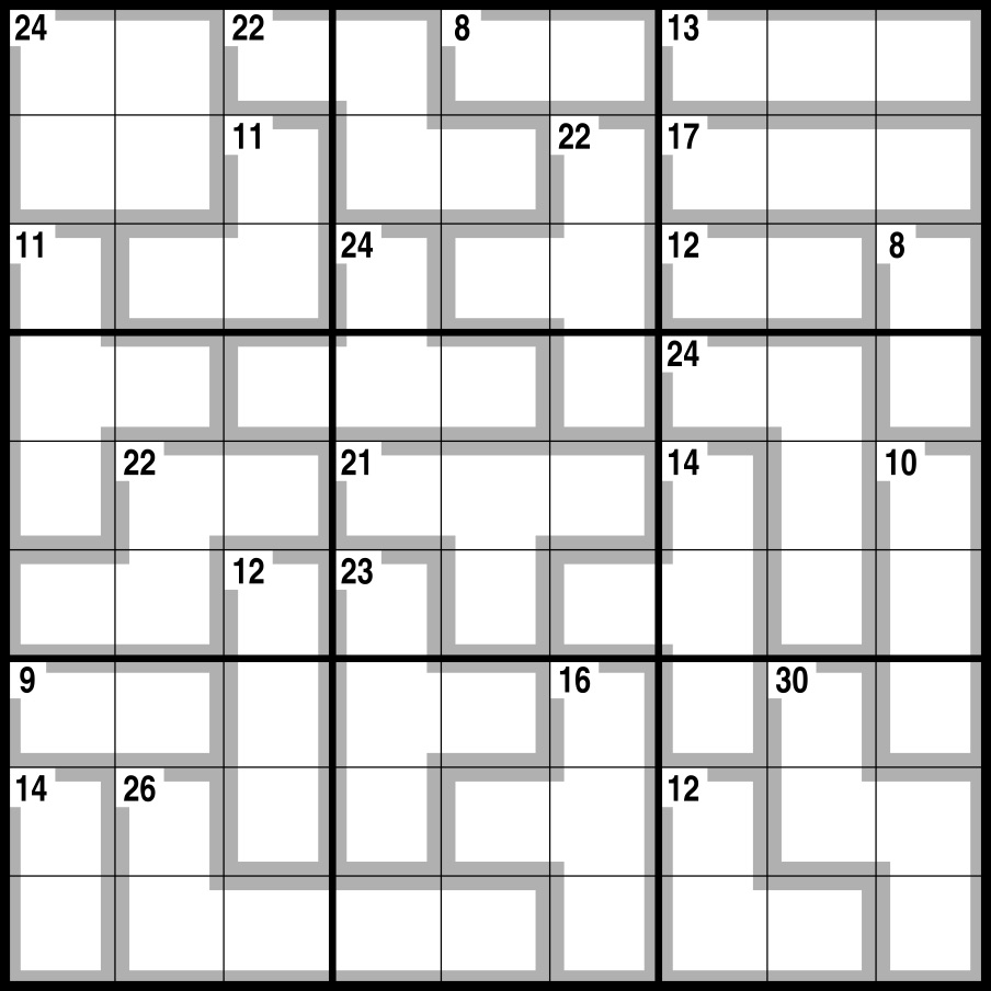 Normal Sudoku rules apply, except the numbers in the cells contained within grey lines add up to the figures in the corner. No number can be repeated within each shape formed by grey lines.
