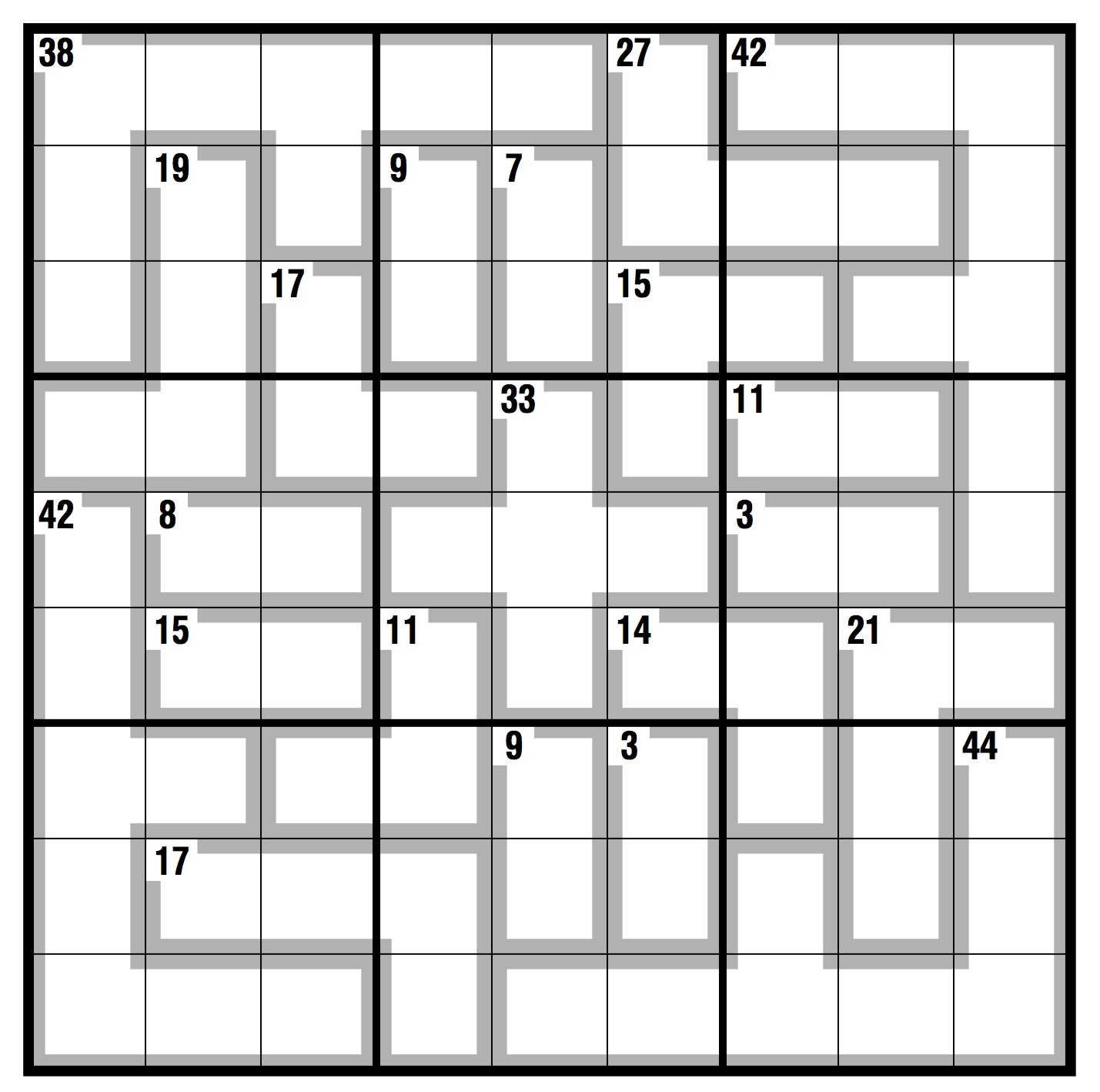 Normal Sudoku rules apply, except the numbers in the cells contained within grey lines add up to the figures in the corner. No number can be repeated within each shape formed by grey lines.