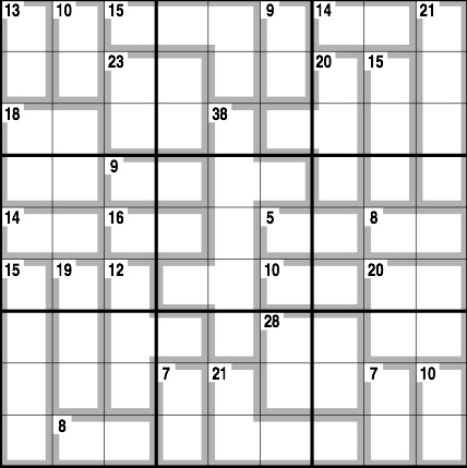 Normal Sudoku rules apply, except the numbers in the cells contained within grey lines add up to the figures in the corner. No number can be repeated within each shape formed by grey lines.