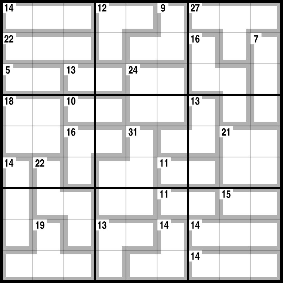 Normal Sudoku rules apply, except the numbers in the cells contained within grey lines add up to the figures in the corner. No number can be repeated within each shape formed by grey lines.