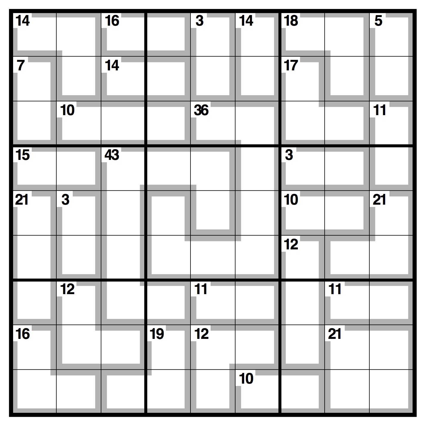 Normal Sudoku rules apply, except the numbers in the cells contained within grey lines add up to the figures in the corner. No number can be repeated within each shape formed by grey lines.