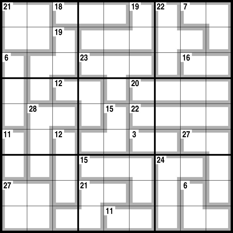 Normal Sudoku rules apply, except the numbers in the cells contained within grey lines add up to the figures in the corner. No number can be repeated within each shape formed by grey lines.
