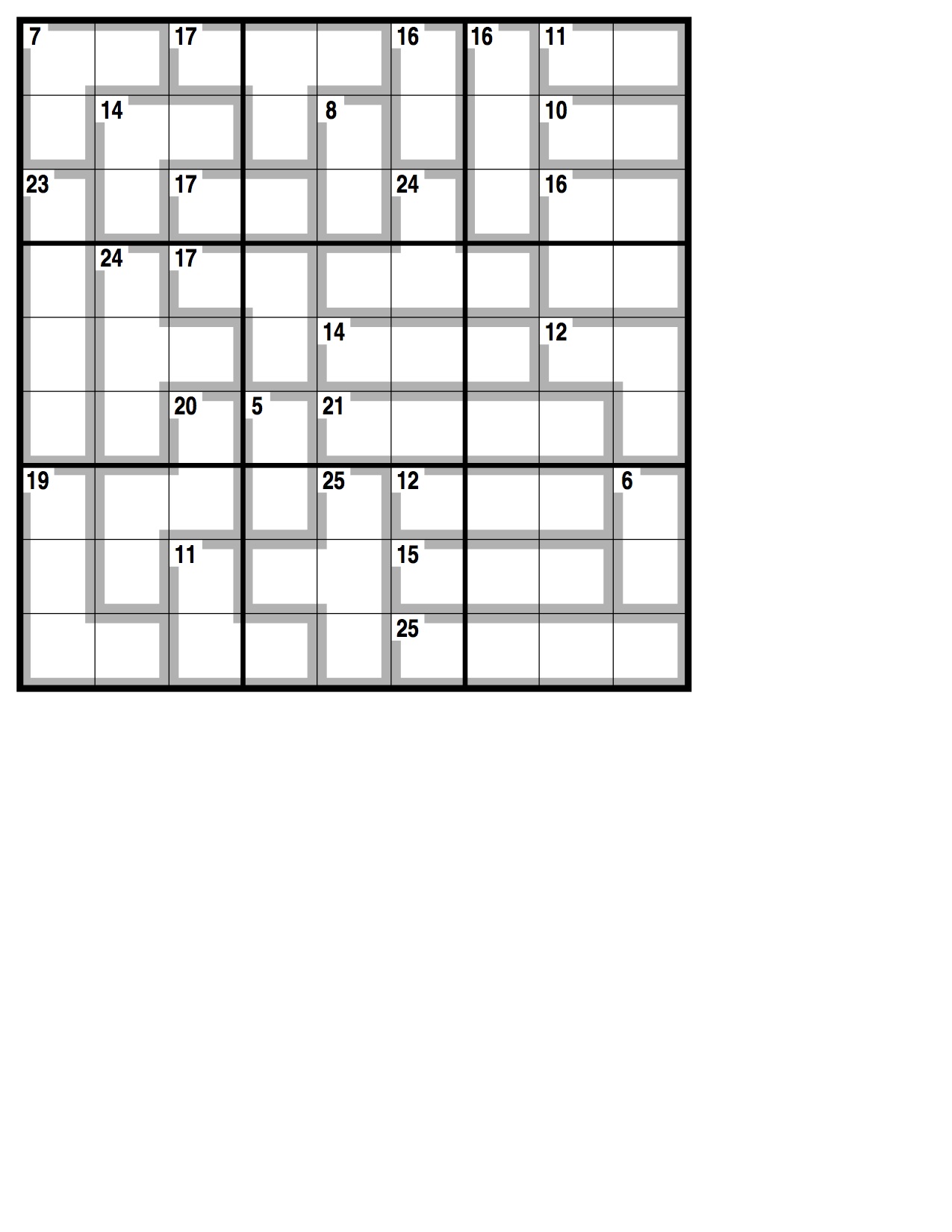 Normal Sudoku rules apply, except the numbers in the cells contained within grey lines add up to the figures in the corner. No number can be repeated within each shape formed by grey lines.