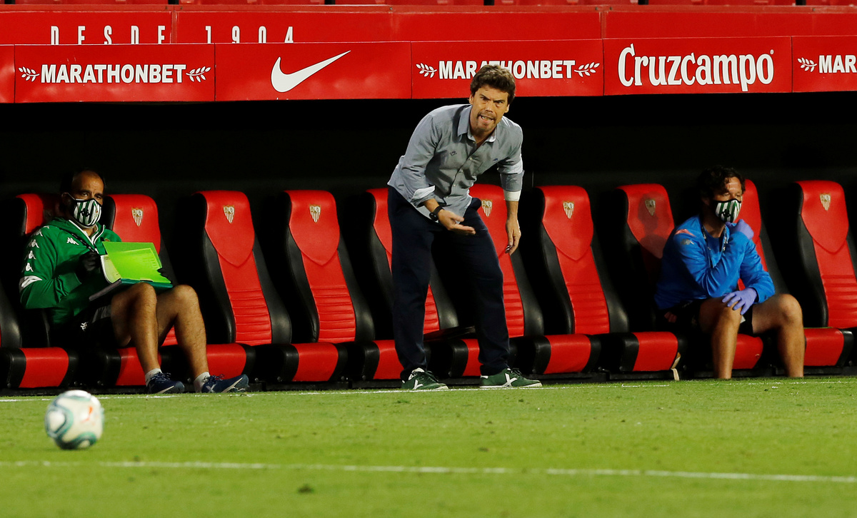 Soccer Football - La Liga Santander - Sevilla v Real Betis - Ramon Sanchez Pizjuan, Seville, Spain - June 11, 2020 Sevilla's Fernando scores their second goal, as play resumes behind closed doors following the outbreak of the coronavirus disease (COVID-19) REUTERS/Marcelo Del PozoSoccer Football - La Liga Santander - Sevilla v Real Betis - Ramon Sanchez Pizjuan, Seville, Spain - June 11, 2020 Sevilla players celebrate after the match. Play resumed behind closed doors following the outbreak of the coronavirus disease (COVID-19) REUTERS/Marcelo Del PozoSoccer Football - La Liga Santander - Sevilla v Real Betis - Ramon Sanchez Pizjuan, Seville, Spain - June 11, 2020 Sevilla players celebrate after the match. Play resumes behind closed doors following the outbreak of the coronavirus disease (COVID-19) REUTERS/Marcelo Del PozoSoccer Football - La Liga Santander - Sevilla v Real Betis - Ramon Sanchez Pizjuan, Seville, Spain - June 11, 2020 Sevilla players celebrate after the match. Play resumes behind closed doors following the outbreak of the coronavirus disease (COVID-19) REUTERS/Marcelo Del PozoSoccer Football - La Liga Santander - Sevilla v Real Betis - Ramon Sanchez Pizjuan, Seville, Spain - June 11, 2020 Sevilla players celebrate after the match, as play resumes behind closed doors following the outbreak of the coronavirus disease (COVID-19) REUTERS/Marcelo Del PozoSoccer Football - La Liga Santander - Sevilla v Real Betis - Ramon Sanchez Pizjuan, Seville, Spain - June 11, 2020 Real Betis coach Rubi reacts as coaching staff wearing protective face masks look on, as play resumes behind closed doors following the outbreak of the coronavirus disease (COVID-19) REUTERS/Marcelo Del PozoSoccer Football - La Liga Santander - Sevilla v Real Betis - Ramon Sanchez Pizjuan, Seville, Spain - June 11, 2020 Sevilla's Fernando celebrates scoring their second goal with teammates, as play resumes behind closed doors following the outbreak of the coronavirus disease (COVID-19) REUTERS/Marcelo Del PozoSoccer Football - La Liga Santander - Sevilla v Real Betis - Ramon Sanchez Pizjuan, Seville, Spain - June 11, 2020 Sevilla's Diego Carlos prepares to take a corner, as play resumes behind closed doors following the outbreak of the coronavirus disease (COVID-19) REUTERS/Marcelo Del Pozo