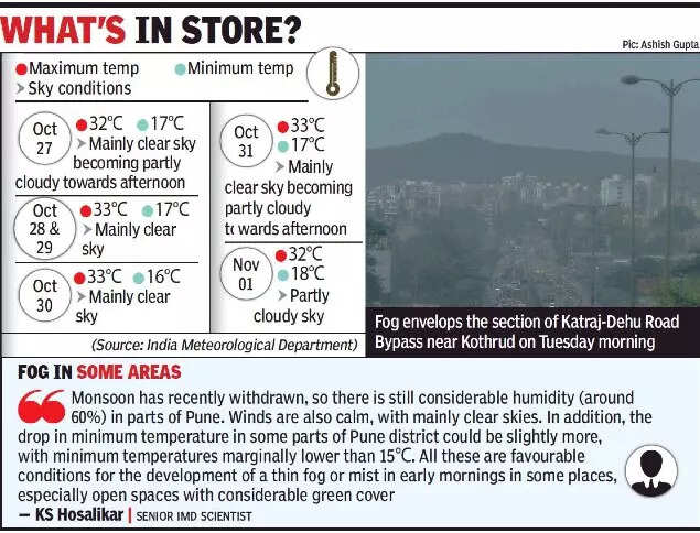 Senior IMD scientist KS Hosalikar, also head of surface instruments division at the Climate Research and Services, IMD, Pune, told TOI, “As per IMD’s forecast for the next five days, the minimum temperature in Shivajinagar is likely to range between 16-17C. Therefore, we do not expect much of a drop in the minimum temperature till November 1 in the city. In some other parts of Pune, depending on the area’s topography, such as NDA, the minimum temperature could be slightly lower.”
