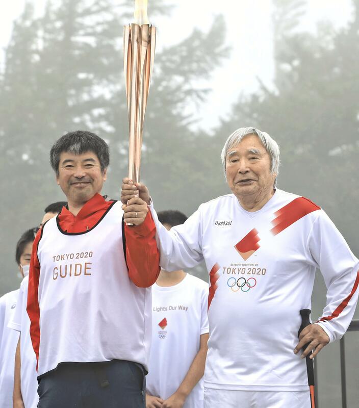 On Sunday, with a trekking pole in his left hand and grabbing the torch with his right hand along with his second son Gota, 51, Miura hoisted the Olympic flame in the air.