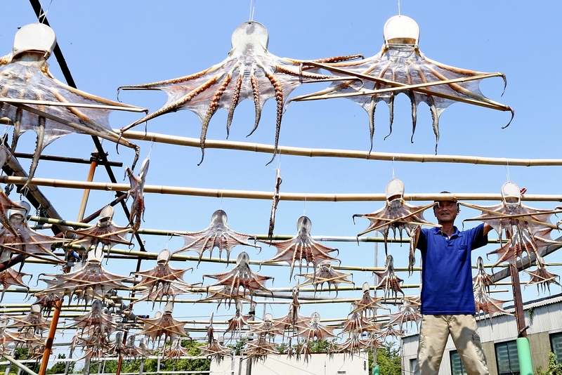 Octopuses are hung up to be dried in the sun and the sea breeze in Harima, Hyogo Prefecture. Production of dried octopuses has reached its peak at Komiya fishing port in the town. Common octopuses caught in and around the Harimanada sea are dried in the sun for about two days so they can be used as ingredients in various dishes. Up to 100 octopuses a day are hung out to dry, and the work continues until the Bon Festival.