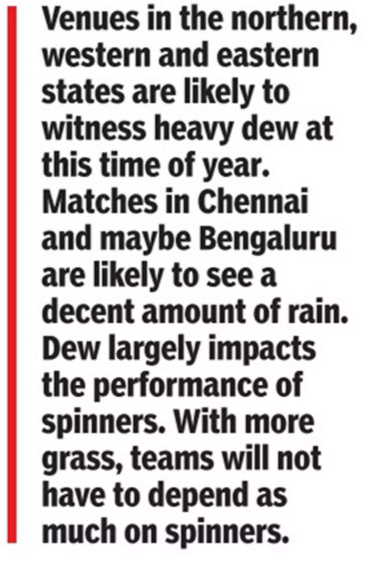 "Venues in the northern, western and eastern states of India are likely to witness heavy dew at this time of year. Matches in Chennai and maybe Bengaluru are likely to see a decent amount of rain. The main idea is to keep the toss out of the equation as much as possible. Dew largely impacts the performance of spinners. With more grass, teams will not have to depend as much on spinners. That will also help in having true surfaces. And ODI games don't need to see very high scores to be interesting," a source told TOI.