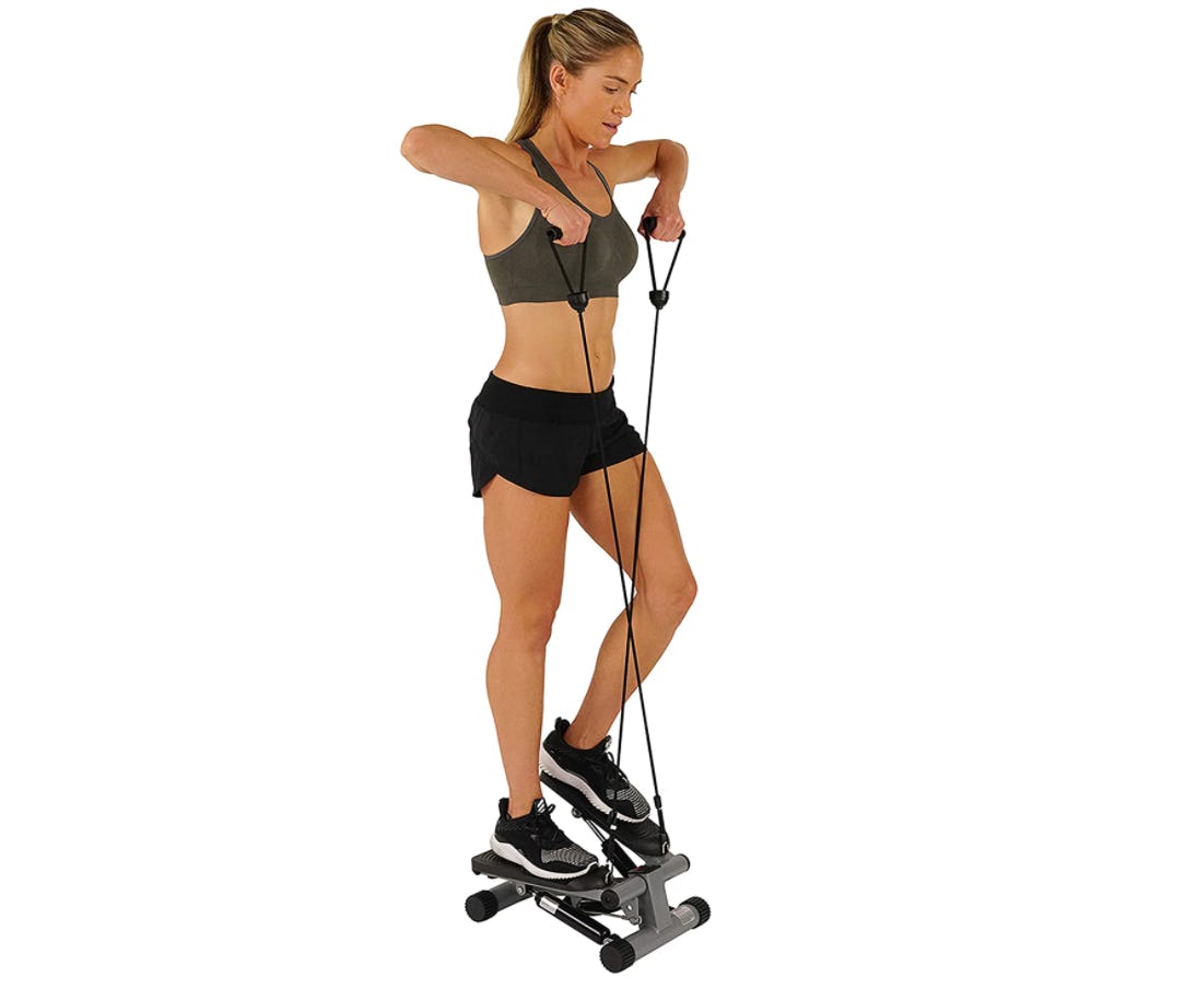 Get a full-body workout using this mini stepper with resistance bands. The compact, lightweight stepper has slip-resistant foot plates, removable resistance bands with grippy foam handles, and an LCD console that displays your workout stats. Plus, you can adjust the height for quick steps or long strides.