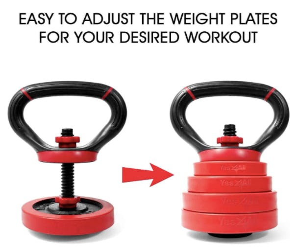 This adjustable kettlebell handle works with the weight plates you already have — just add your 1- and 2-inch plates to the loading pin to reach your desired weight and you're ready to lift. The grippy handle weighs just 1 pound, so it's easily portable, and it withstands up to 100 pounds.